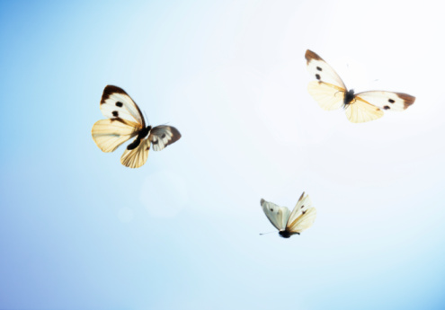 200326694-001 Published August 16, 2016 at 495 × 345 Large white butterflies (Pieris brassicae) in flight, low angle view
